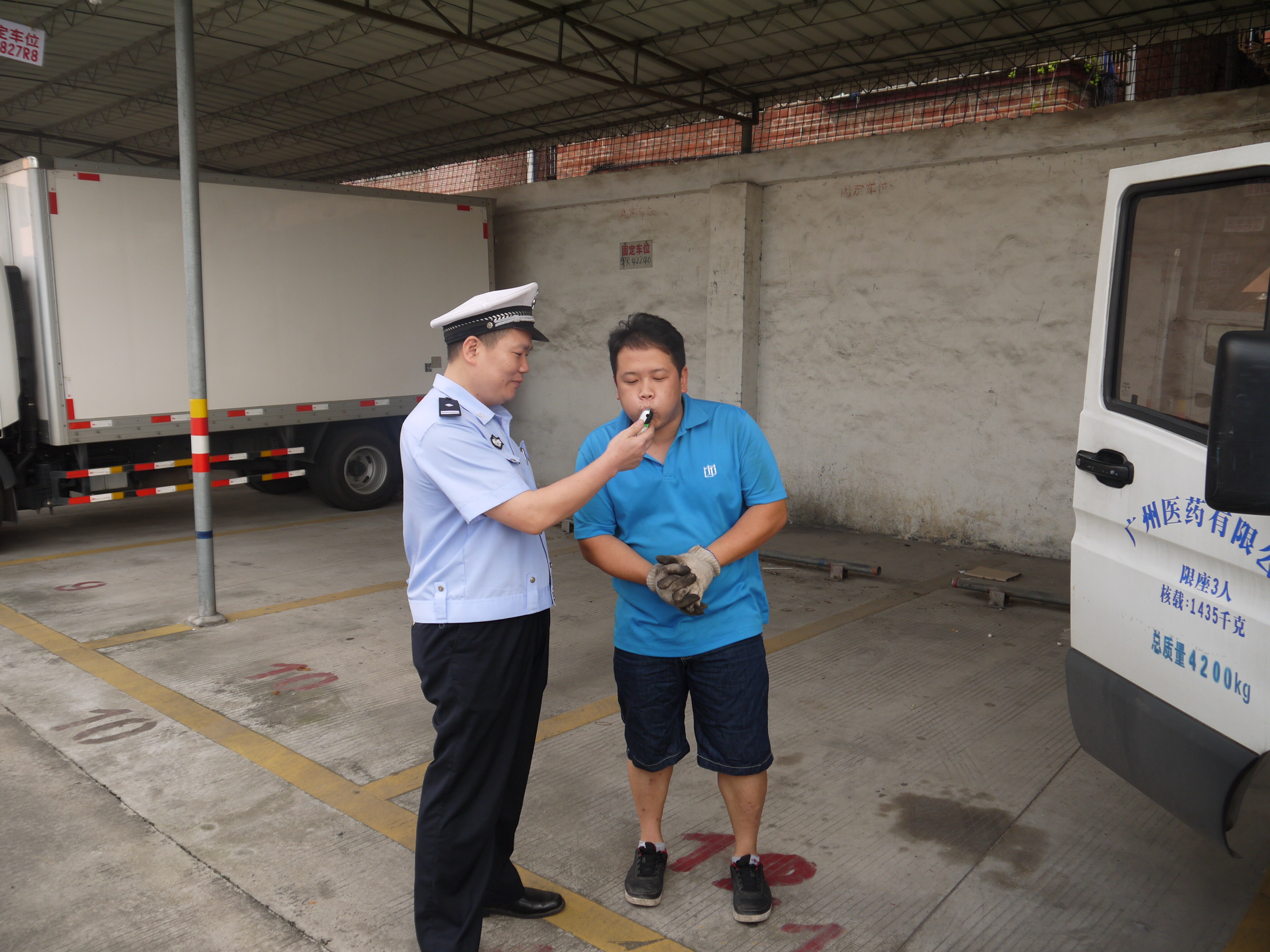廣州交警荔灣大隊(duì)謝沅宏主任對(duì)駕駛員進(jìn)行酒精測(cè)試