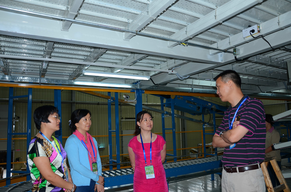 營銷總部副總經(jīng)理、物流中心總監(jiān)鄧健輝(右)向工會(huì)委員參觀獅山物流中心