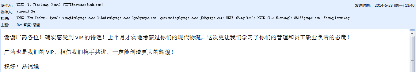 諾和諾德總監(jiān)易錦雄發(fā)來(lái)感謝郵件(截圖),稱受到了廣州醫(yī)藥“VIP待遇”