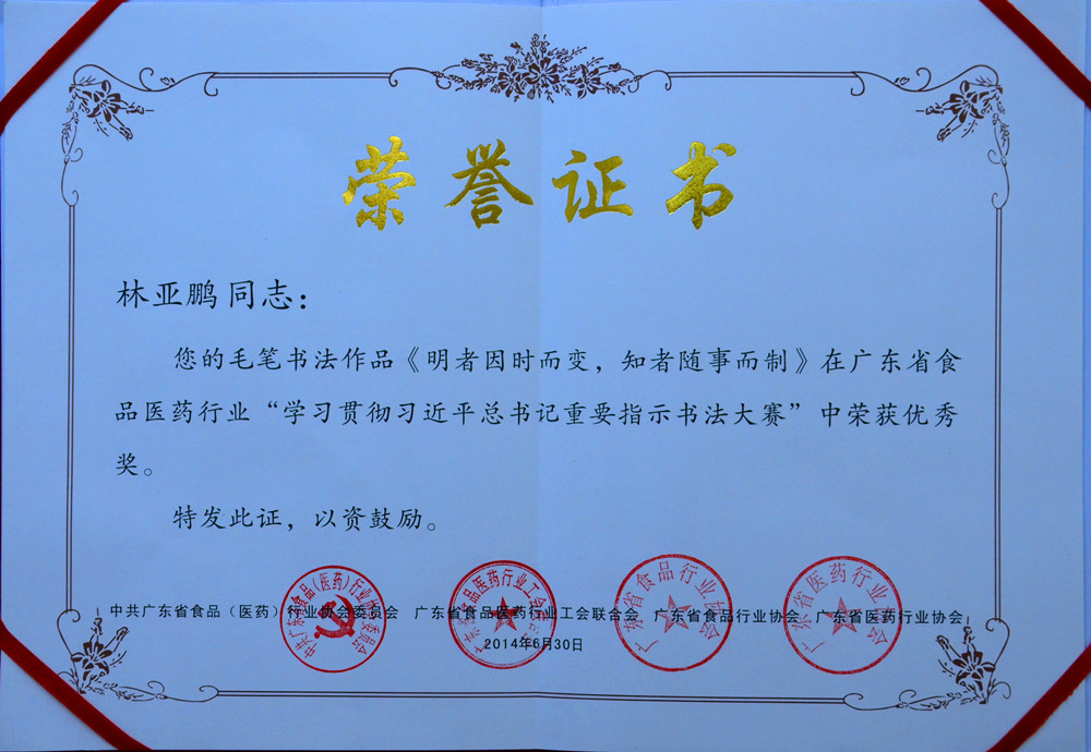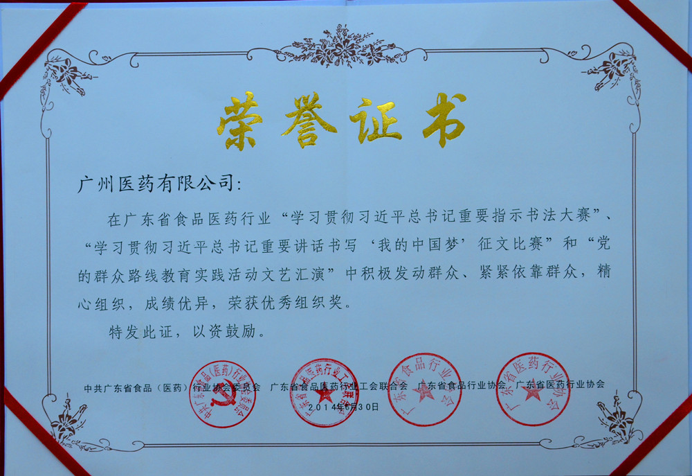 為創(chuàng)新在黨的群眾路線教育實(shí)踐的活動(dòng)形式,豐富實(shí)踐成果,引導(dǎo)廣大干部、黨員和員工學(xué)習(xí)研究習(xí)近平總書(shū)記對(duì)“中國(guó)夢(mèng)”的闡釋,廣州醫(yī)藥有限公司(下稱:廣州醫(yī)藥)在“學(xué)習(xí)貫徹習(xí)近平總書(shū)記重要指示書(shū)法大賽”、“學(xué)習(xí)貫徹習(xí)近平總書(shū)記重要講話書(shū)寫(xiě)‘我的中國(guó)夢(mèng)’征文比賽”中積極參與,成績(jī)優(yōu)異,榮獲由中共廣東省食品(醫(yī)藥)行業(yè)協(xié)會(huì)委員會(huì)、廣東省食品醫(yī)藥行業(yè)工會(huì)聯(lián)合會(huì)、廣東省食品行業(yè)協(xié)會(huì)、廣東省醫(yī)藥行業(yè)協(xié)會(huì)聯(lián)合頒授的“優(yōu)秀組織獎(jiǎng)”。
