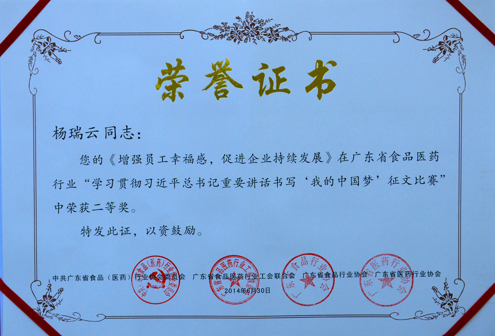 廣州醫(yī)藥黨委副書(shū)記、紀(jì)委書(shū)記、工會(huì)主席楊瑞云《增強(qiáng)員工幸福感,促進(jìn)企業(yè)持續(xù)發(fā)展》在廣東省食品醫(yī)藥行業(yè)“學(xué)習(xí)貫徹習(xí)近平總書(shū)記重要講話書(shū)寫(xiě)‘我的中國(guó)夢(mèng)’征文比賽”中榮獲二等獎(jiǎng)。本部物流中心林亞鵬書(shū)法作品《明者因時(shí)而變,知者隨事而制》在廣東省食品醫(yī)藥行業(yè)“學(xué)習(xí)貫徹習(xí)近平總書(shū)記重要指示書(shū)法大賽”中榮獲優(yōu)秀獎(jiǎng)。
