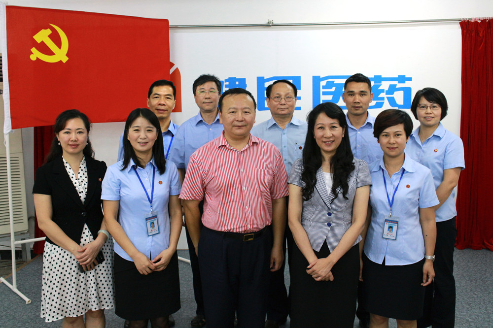 廣州醫(yī)藥黨委書(shū)記蘇廣豐(一排左三)、黨委副書(shū)記楊瑞云(一排右二)與健民連鎖黨支部新舊委員合影