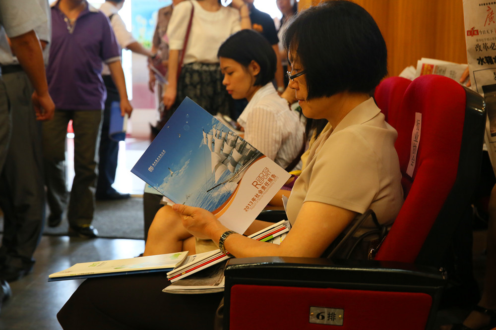 現場觀眾認真翻閱《2013年廣州醫(yī)藥有限公司社會責任報告書》