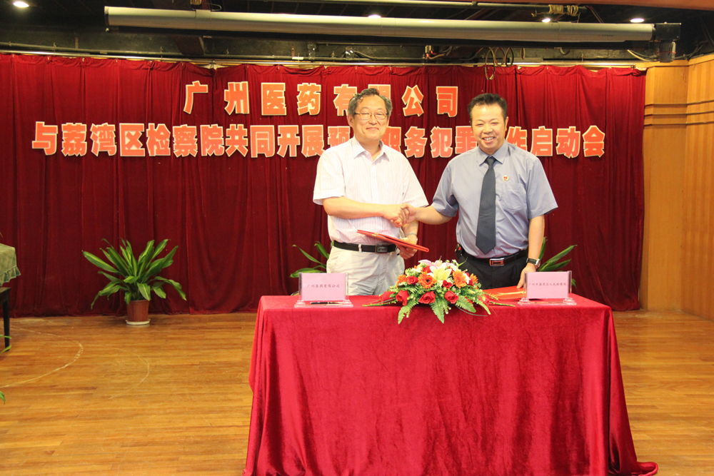 胡笳檢察長(zhǎng)和于景輝總裁分別代表荔灣區(qū)人民檢察院和廣州醫(yī)藥有限公司簽訂了《關(guān)于聯(lián)合建立預(yù)防職務(wù)犯罪工作機(jī)制的意見(jiàn)》