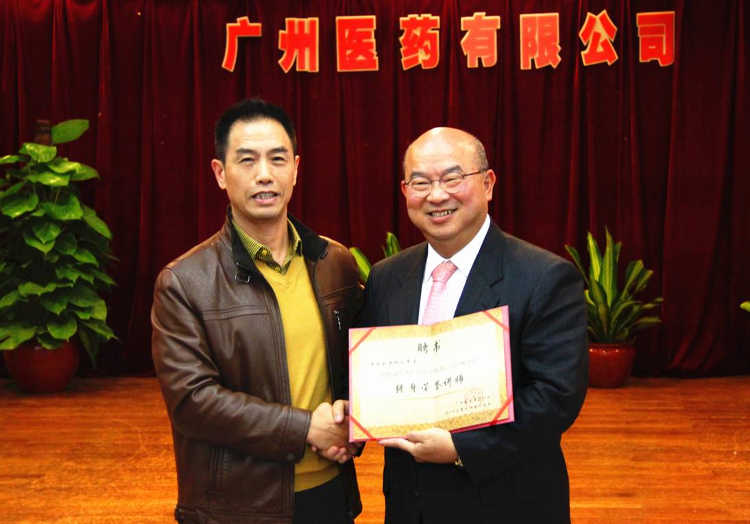廣州醫(yī)藥副總裁、沙槐學(xué)院院長劉允堅向李炳容董事長頒發(fā)“終身榮譽講師”聘書