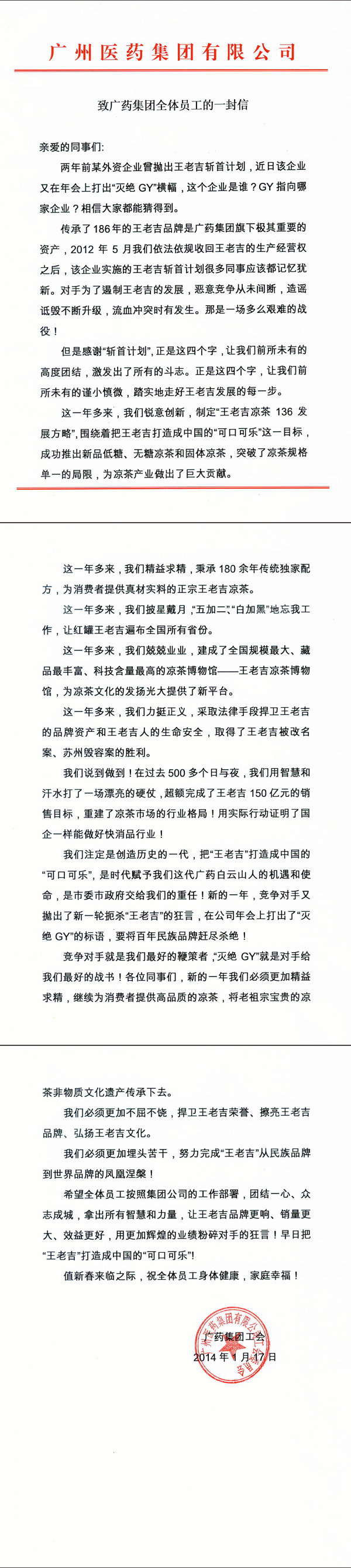 希望全體員工按照集團(tuán)公司的工作部署,團(tuán)結(jié)一心、眾志成城,拿出所有智慧和力量,讓王老吉品牌更響、銷量更大、效益更好,用更加輝煌的業(yè)績粉碎對手的狂言!早日把“王老吉”打造成中國的“可口可樂”! 值新春來臨之際,祝全體員工身體健康,家庭幸福!
