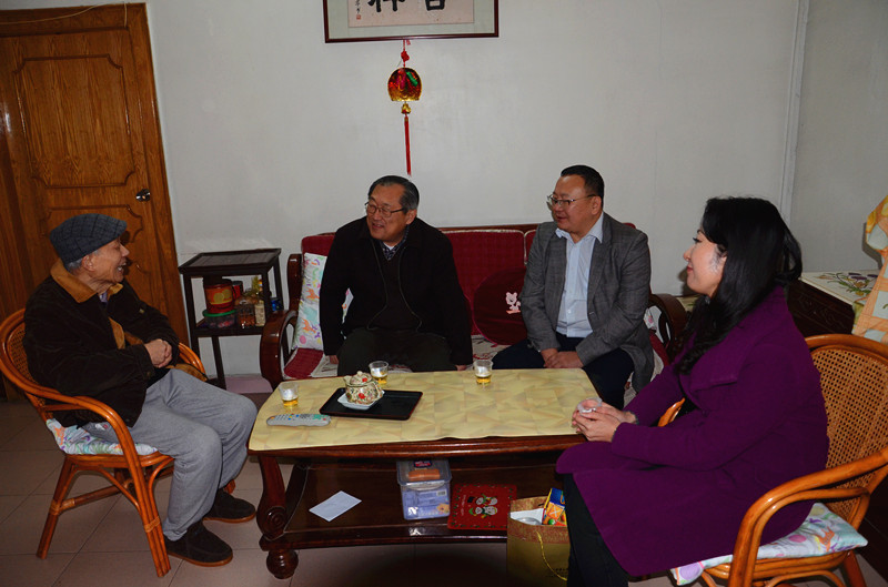 廣州醫(yī)藥黨委委員、總裁于景輝(左二)、廣州醫(yī)藥黨委書記蘇廣豐(右二)、廣州醫(yī)藥黨委副書記,工會主席楊瑞云(右一)慰問廣州醫(yī)藥老領(lǐng)導(dǎo)顧定生(左一)