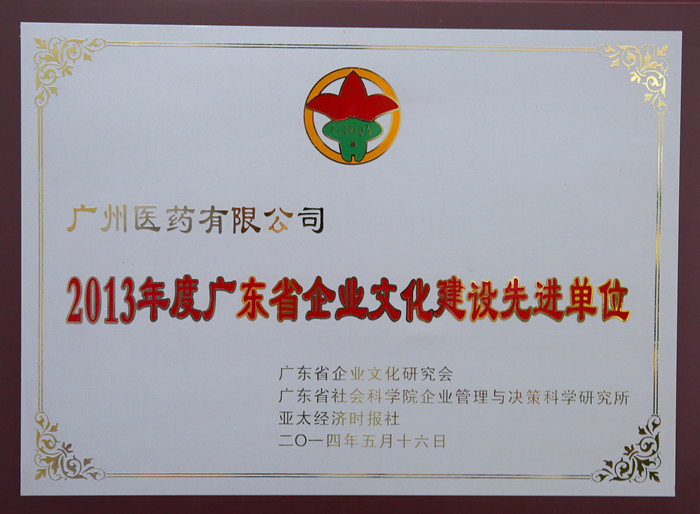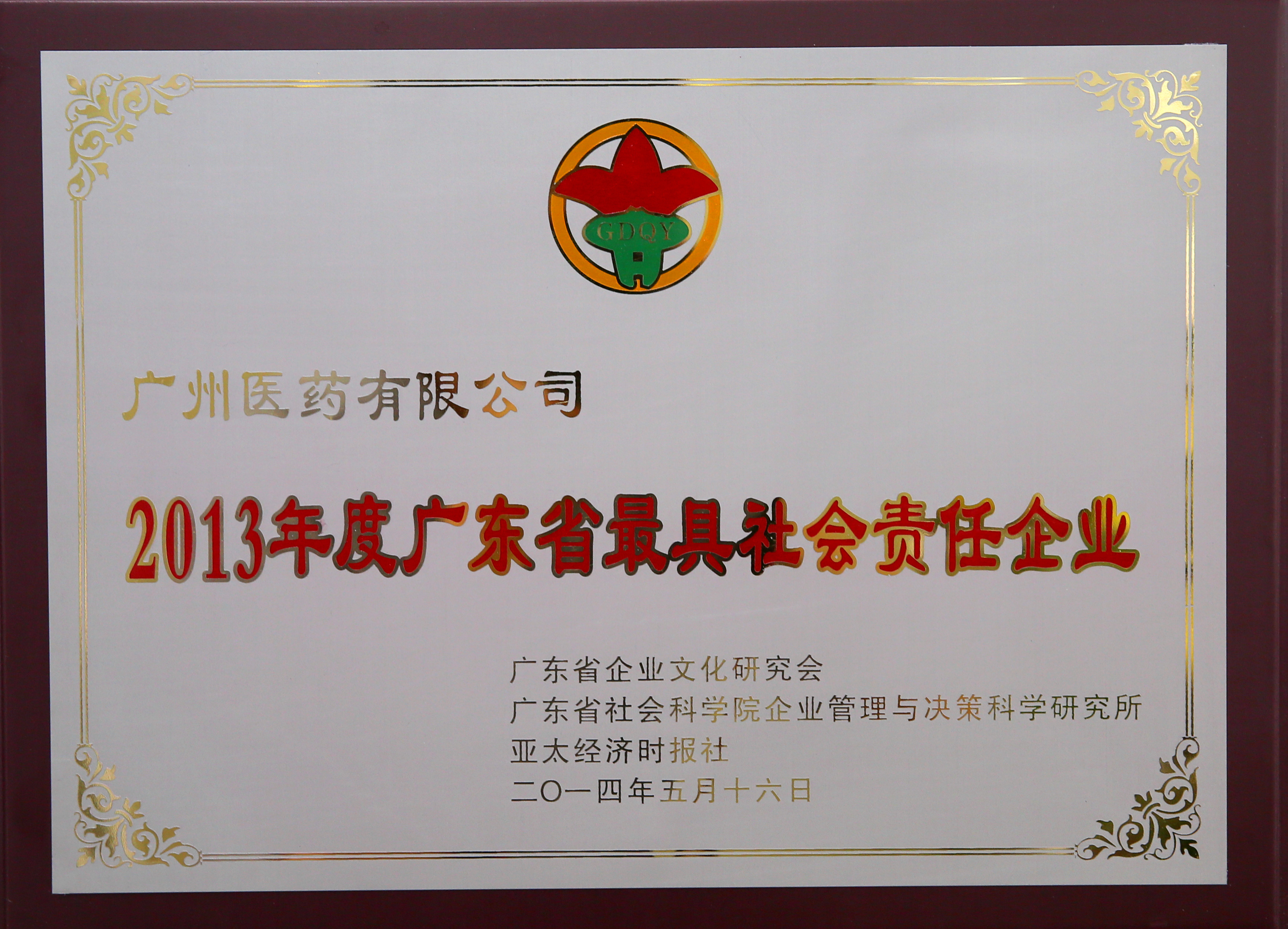 2014年5月16日,由廣東省企業(yè)文化研究會、廣東省社會科學院企業(yè)管理與決策科學研究所、亞太經(jīng)濟時報社、廣州企業(yè)評價協(xié)會共同舉辦的2014年廣東省企業(yè)文化建設論壇暨企業(yè)文化建設系列表彰在廣州大廈舉行。廣州醫(yī)藥有限公司獲頒“2013年度廣東省具社會責任企業(yè)”、“2013年度廣東省企業(yè)文化建設先進單位”榮譽稱號。